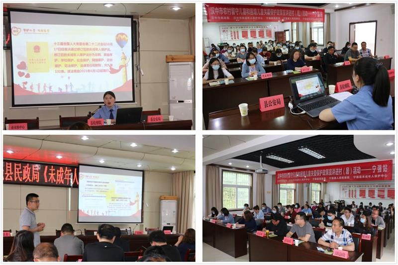 新修订的《中华人民共和国未成年人保护法》将于2021年6月1日施行,为深入学习宣传贯彻《未成年人保护法》,推动儿童福利保障政策落地见效。5月21日,汉中市未成年人保护中心联合宁强县民政局、宁强县人民检察院开展“儿童关爱保护政策宣讲进村(居)”活动。宁强县未成年人保护中心工作人员、全县18个乡镇(街道办)儿童督导员、部分村(居)儿童主任、学校教师共计60余人参加此次宣讲活动。宁强县公安局、教体局、妇联、团县委等相关部门负责同志出席了本次活动。