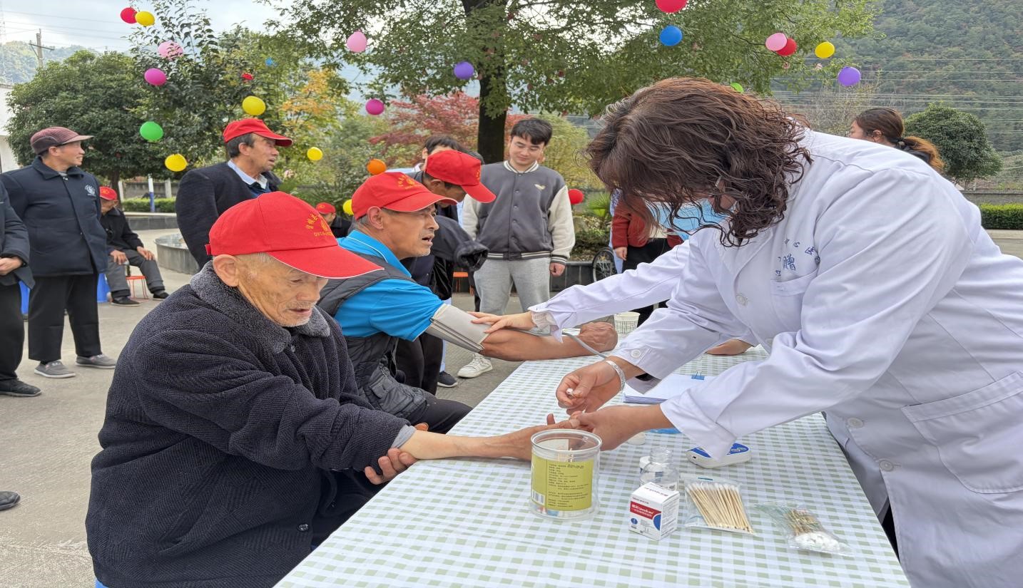 活动现场,大家分工协作,用实际行动传递温暖。来自江口镇卫生院的医护人员为老人们逐一测量血压、血糖,耐心解答关于慢性病管理、秋冬养生的疑问,并为每位老人建立简易健康档案,给出个性化康养建议。“医生说得太详细了,还特意嘱咐我天冷要注意保暖,这比送啥礼物都实在!”82岁的杨爷爷拿着健康建议卡,笑得合不拢嘴。