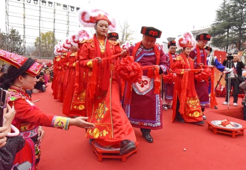 16对新人身着色彩鲜艳、绣饰精美的传统羌族喜服,以水为媒、以城为证,在羌族传统习俗与现代新风的交融中,许下相守一生的美好诺言。上午9时,激昂的开山锣鼓奏响喜庆乐章,新人们从宁强县城通济门整装出发,开启热闹的城市巡游。送亲队伍中,40名工作人员手持“抵制高价彩礼”“婚俗改革推动文明”“彩礼减负幸福加分”等主题手举牌,沿途向市民传递婚事新办、简办的理念,让文明婚俗宣传润物无声。