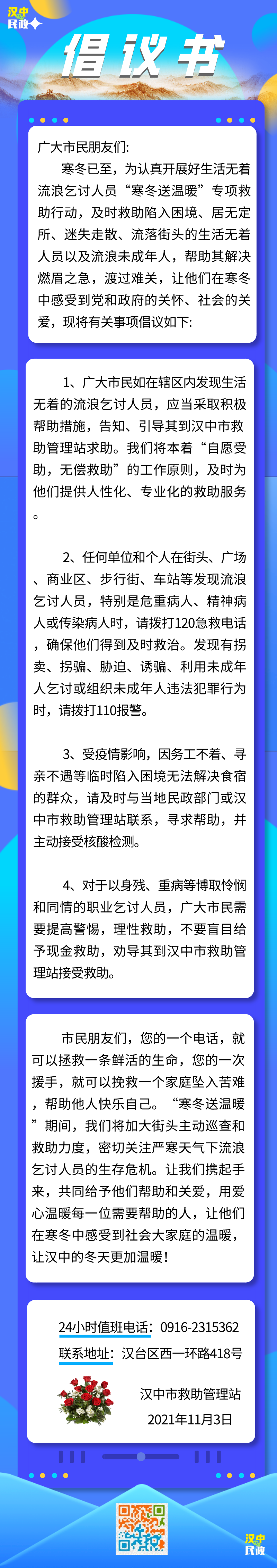 市民朋友们,您的一个电话,就可以拯救一条鲜活的生命,您的一次援手,就可以挽救一个家庭坠入苦难,帮助他人快乐自己。“寒冬送温暖”期间,我们将加大街头主动巡查和救助力度,密切关注严寒天气下流浪乞讨人员的生存危机。让我们携起手来,共同给予他们帮助和关爱,用爱心温暖每一位需要帮助的人,让他们在寒冬中感受到社会大家庭的温暖,让汉中的冬天更加温暖!